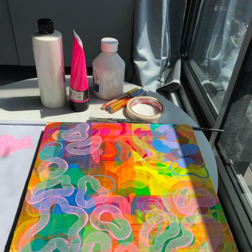 Mekayla Dionne is an emerging Métis abstract painter. She was born in 1997 and spent her childhood in a small rural town in Ontario. Her love of art started at a young age, drawing and painting on anything she could get her hands on, and eventually taking it more seriously throughout high-school, in which she had a very encouraging Art Teacher who was a painter herself. After high-school she moved to Toronto to attend the Ontario College of Art & Design (OCAD) University and obtained a Bachelors of Fine Art in Drawing & Painting. Throughout her years in University she developed an interest in abstract art, drawing inspiration from the world around her including nature, music, and the city. Post-graduation she immediately began working as an Art Teacher and Program Manager at a local non-profit called Art City which offers free art classes to children and youth in St. James Town, Toronto. Mekayla has continued to develop her professional practice and has participated in a variety of exhibitions, publications, and collaborations since graduating.
